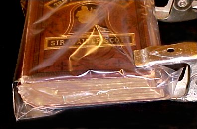 3. Book Repair in TransitSpine deformation in books, variously described as cocking, lean, twist and roll, is a flaw that can often be corrected by simply manipulating the text block into a position opposite the one it naturally falls into, pushing it slightly beyond the point at which resistance is met, stabilizing it with clamps, and waiting a few hours or (sometimes) days for things to return to square. The original deformation isn't eliminated, of course, but the presence of new deformation in the opposite direction balances things out so as to give the book a better, closer to square, appearance. If a book is seriously deformed, fragile, or perfect bound with a glue that has become brittle, it's probably best to do nothing. Introducing further deformation to a binding that has already lost some of its integrity will often make things worse. If the binding is tight, however, it will usually remain so, or reasonably so, at the completion of this process. As in all repairs, practice on your excess copies of microwave cookbooks first and under no circumstances attempt this with a valuable book. If your deformed book is distinctly not valuable, it doesn't make sense to spend time repairing it with the above method, but a simple, much faster technique may be used in the packaging process to accomplish the same result. After sealing the book in a poly bag, manipulate it into position, clamp it on both ends, making certain that the edges of the boards or wraps are parallel, and wrap the center with packaging tape.